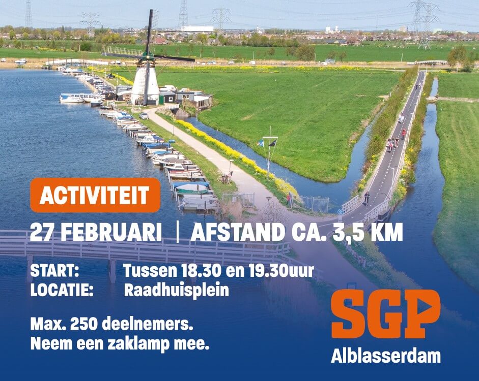 ALBLASSERDAM – SGP Alblasserdam organiseert op vrijdagavond 27 februari 2026 een wandelpuzzeltocht door het dorp.
