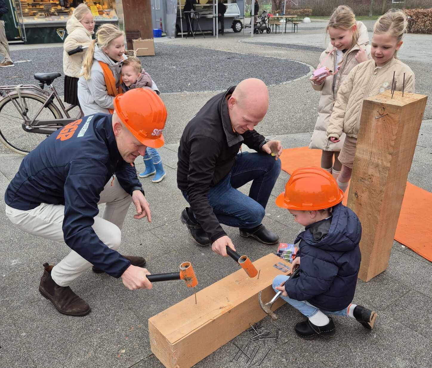 Wie wilde, kon zijn krachten meten bij het spijkerslaan: grote houten blokken, hamers, oranje bouwhelmen en lange spijkers zorgden voor een ontspannen wedstrijdje dat meteen het thema van de campagne verbeeldde. Bouwen en Behouden — niet alleen als programmatitel, maar ook letterlijk voelbaar op het plein.