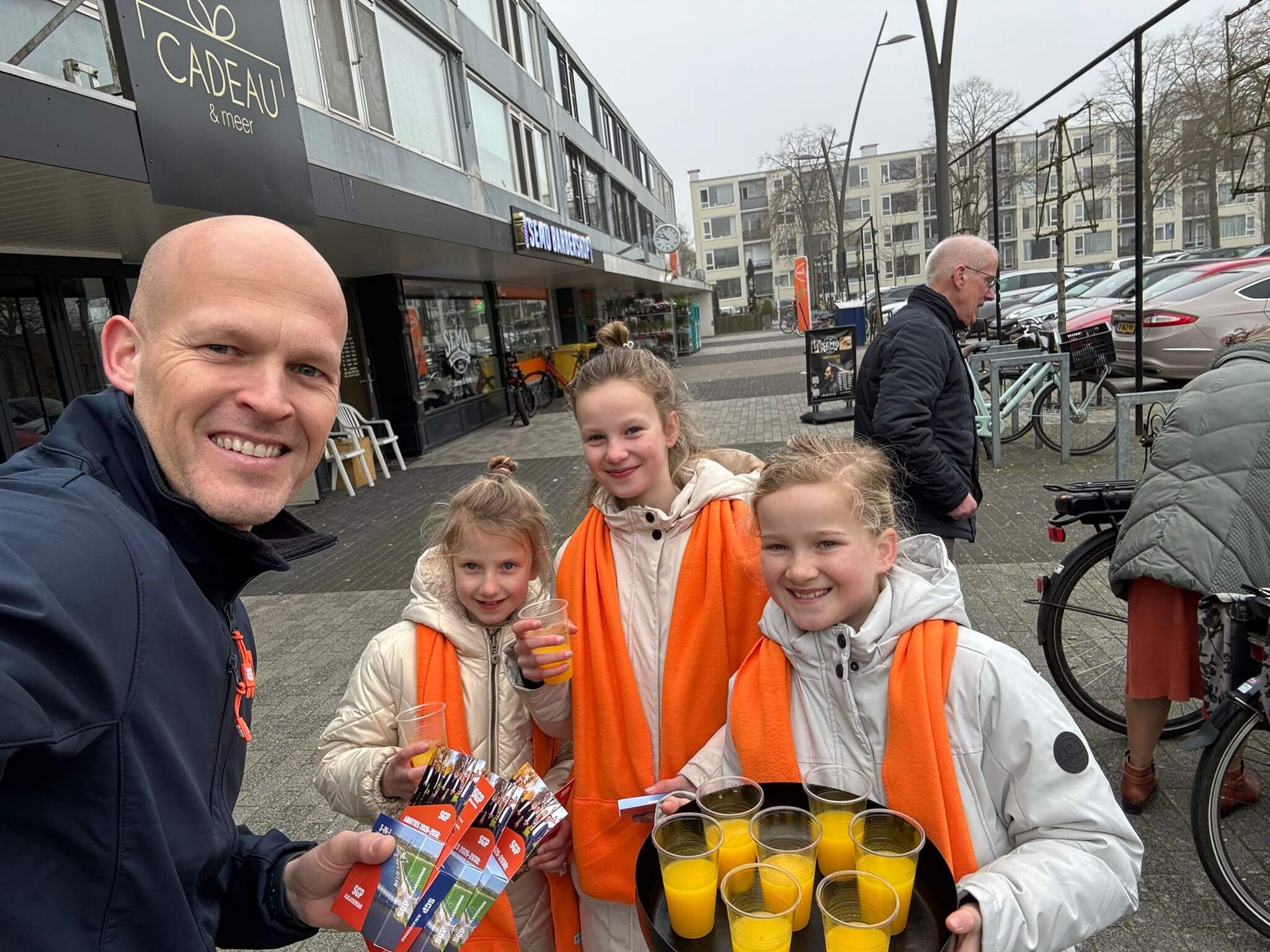 Alle bezoekers, marktkooplieden en winkeliers werden ontvangen met een glas vers geperst sinaasappelsap — toepasselijk oranje, net als de SGP. Een kleine attentie die bij velen in de smaak viel.
